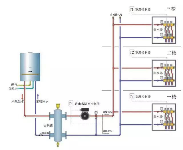 要解決這個(gè)問(wèn)題,我們可以在壁掛爐和末端之間設(shè)置一個(gè)去耦罐,二次側(cè)再增加一個(gè)循環(huán)泵,就構(gòu)成二次系統(tǒng)。